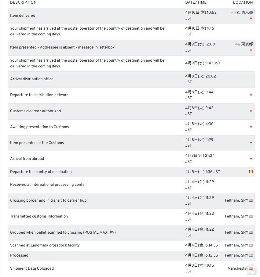 その後日本の税関を通過し、日本郵便に受け継がれました(配達が日本郵便だったので)。そして4月10日の10:53に受け取りました。