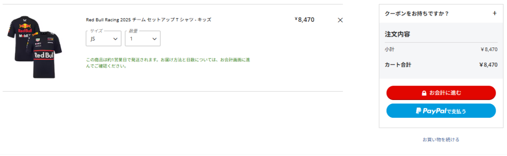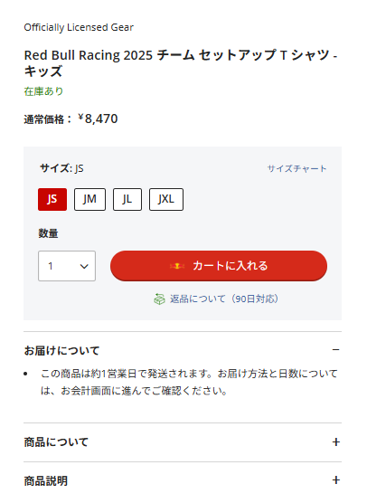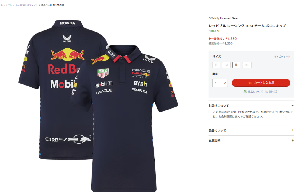 f1の公式ショップ「F1ストア」をチェックしたところ、子供用のサイズが売られていました。2025年の最新のユニフォームが8000円程度でした。しかし、その下に2024年のポロシャツが半額程度で販売されていました。サイトは日本語です。